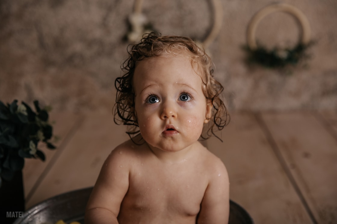 Después de cada smash cake los peques terminan llenos de tarta y nata. Por eso decidimos bañarlos y por supuesto no podíamos perdernos un momento así. En muchas ocasiones, el baño nos da imágenes tan simpáticas como la propia sesión de cumple. Casi no podemos entender una sesión sin la otra. Por eso, la sesión de primer cumpleaños lleva siempre incluida una mini sesión de baño.